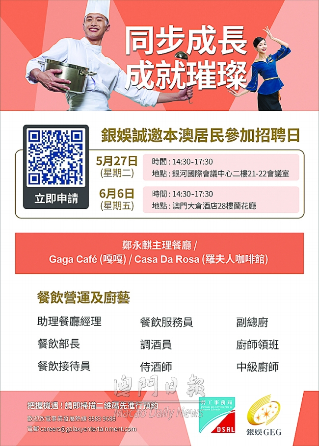 查看详情【本報消息】為配合澳門“創意城市美食之都”發展,以及促進澳門居民就業,勞工事務局和新銀河娛樂二〇〇六有限公司(下稱“銀河娛樂”)分別於五月及六月合作舉辦酒店業餐飲範疇專場配對會,藉此招聘有意投身餐飲事業的澳門居民。 專場配對會分別於五月二十七日下午及六月六日下午舉行,合共提供一百六十一個職位空缺,涉及副總廚、..