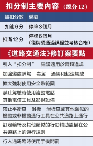 【本報消息】議論多年的駕駛“扣分制”進入立法日程,行政會完成討論修訂《道路交通法》草案,將送交立法會審議,當中焦點落在引入“扣分制”。交通事務局長林衍新表示,“扣分制”擬設十二分,不服從指揮及監察交通執法人員的命令;不遵守補充法規特別規定的禁止標誌將被扣分,扣滿分停牌六個月。“扣分制”不設年期清零機制,但扣至七分時,可..