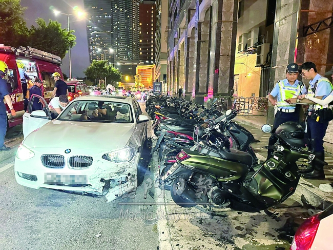 私家車失控撞路邊車兩途人傷 七旬司機涉酒駕危駕被捕 【本報消息】新口岸孫逸仙大馬路昨晚發生涉及一輛私家車懷疑失控猛撞停泊路旁的電單車及私家車事故,更有一男一女途人被撞傷,其中男途人懷疑右腳骨折,送院救治。 男途人被撞疑骨折 事發於昨晚九時許,治安警及消防局先後接報上述馬路近帝景苑..