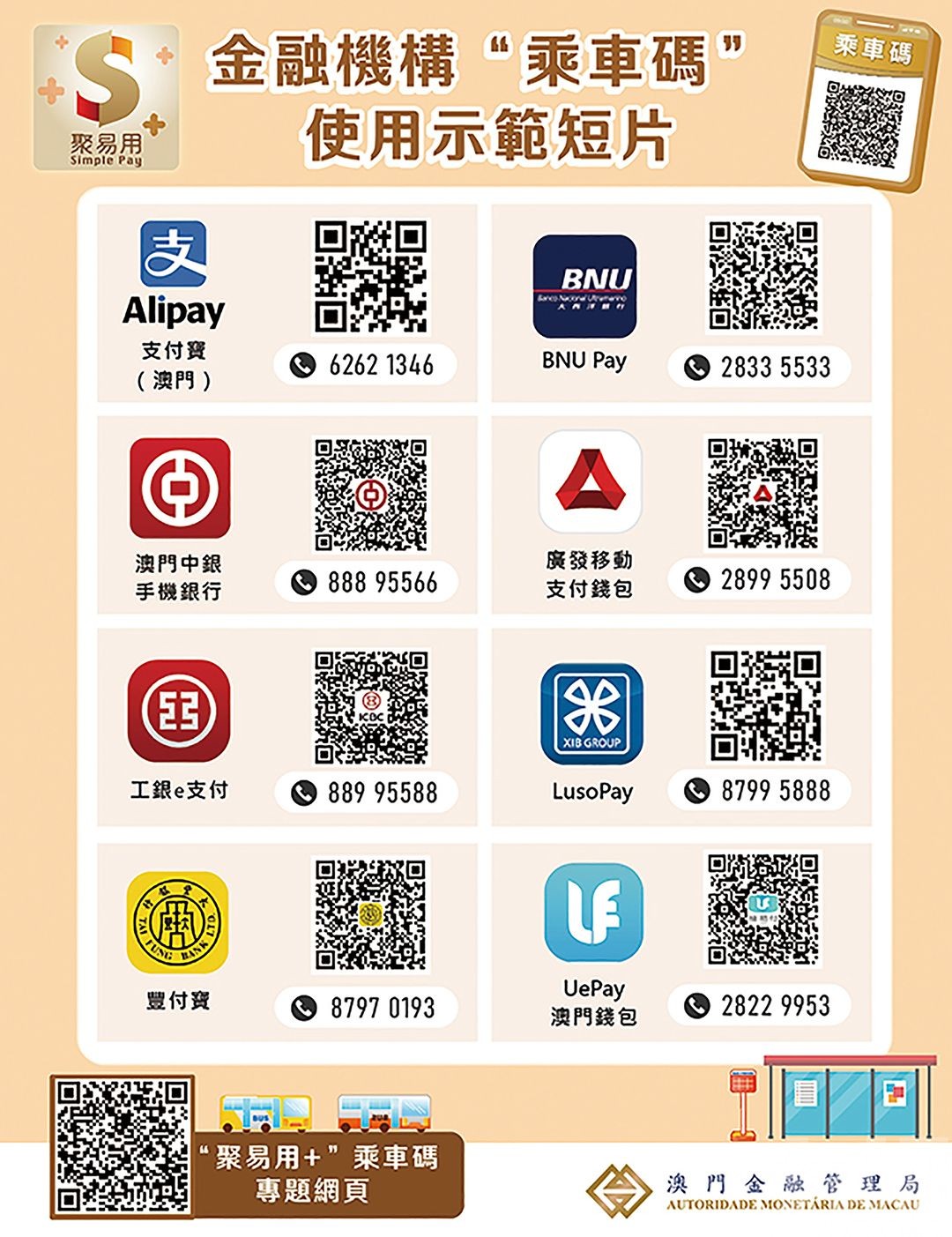 查看详情為促進移動支付創新及回應社會訴求,經澳門金融管理局協調,今(11)日起,本澳金融機構客戶以「聚易用+」(「Simple Pay+」)任一支付工具,包括支付寶澳門、澳門中銀手機銀行、廣發移動支付錢包、工銀e支付、LusoPay、MPay、豐付寶、UePay澳門錢包,以及BNU Pay,所生成的「乘車碼」支付巴士車資,均可享現有的巴士車資及轉乘優惠(長者、殘..