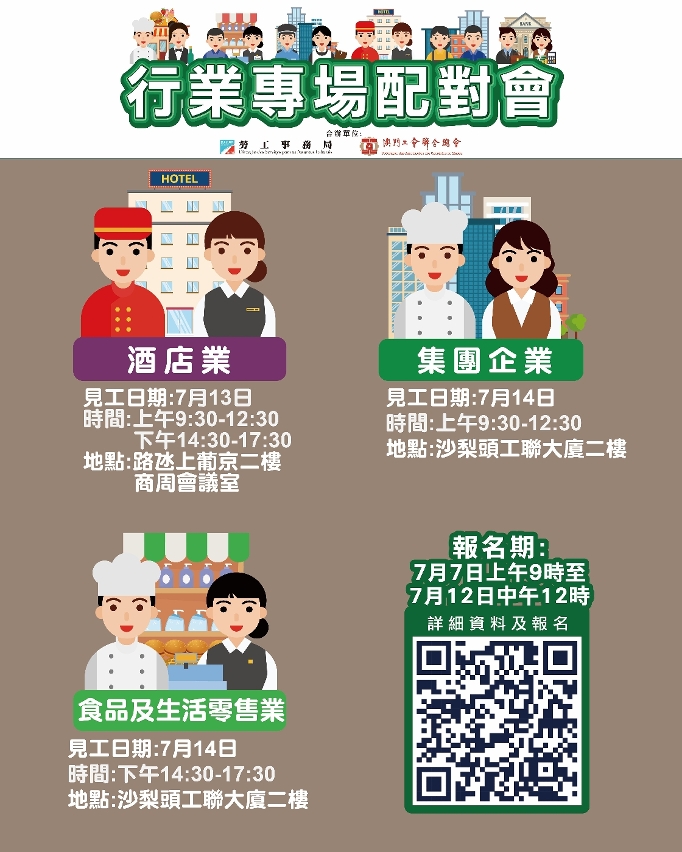 為協助有求職需求的澳門居民盡快就業,以及為緩解業界的人資需求壓力,勞工事務局與澳門工會聯合總會合作,7月第二周舉辦3場行業專場配對會,合共提供360個空缺。報名日期為7月7日上午9時至7月12日中午12時。3場配對會提供職缺360個7月13日上午及下午舉辦酒店業配對會,提供63個職位空缺,涉及公共區域主任、房務主任、司機(轎車服務)、服務專員..