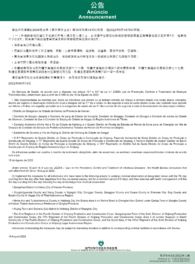 新型冠狀病毒感染應變協調中心(下稱應變協調中心)宣佈,因應內地的疫情變化,衛生局根據第2/2004號法律《傳染病防治法》第10條和第14條的規定,自2022年9月28日凌晨1時起,新增或取消對曾到內地相關區域人士的防疫措施:(一) 新增對曾經到過以下地點的所有入境及已入境人士,必須遵守在指定地點接受醫學觀察直至離開當地翌日起計第7天,但..