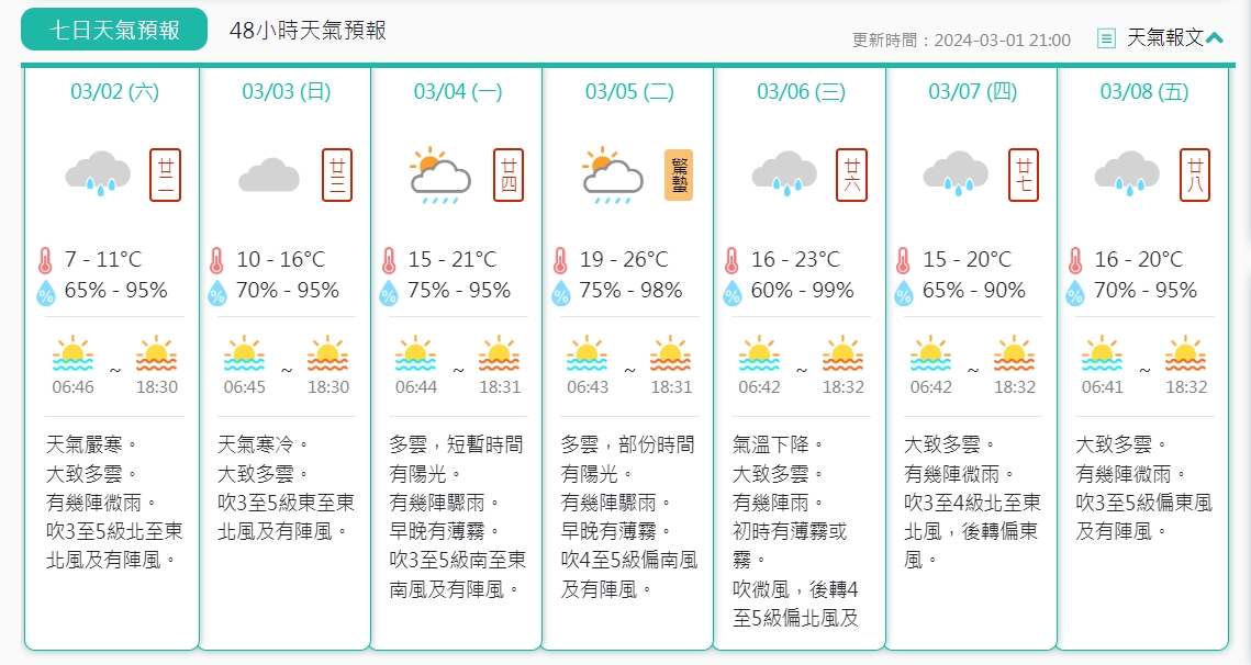 氣象局七日天氣預報顯示,明日天氣嚴寒,大致多雲,有幾陣微雨,吹3至5級北至東北風及有陣風,氣溫約為攝氏7至11度;3月3日,天氣寒冷,大致多雲,吹3至5級東至東北風及有陣風,氣溫約為攝氏10至16度;3月4日,多雲,短暫時間有陽光,有幾陣驟雨,早晚有薄霧,吹3至5級南至東南風及有陣風,氣溫約為攝氏15至21度。